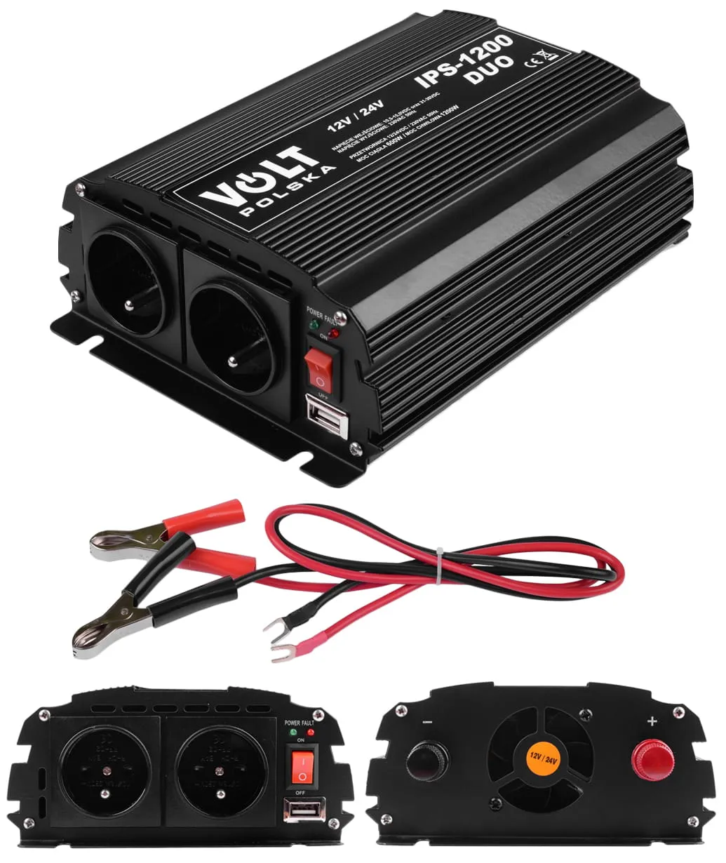 Elektroniczna przetwornica IPS 1200 DUO służy do zasilania urządzeń elektrycznych wymagających napięcia przemiennego 230V z akumulatorów i instalacji samochodowych o napięciu stałym 12V lub 24V.