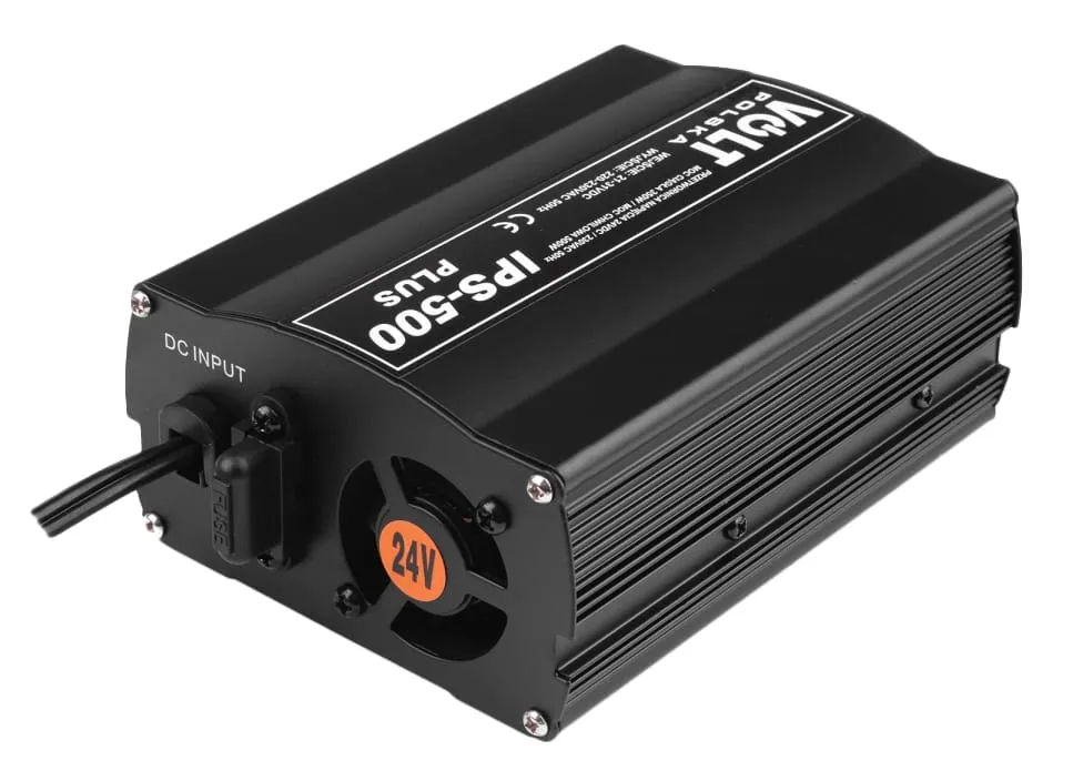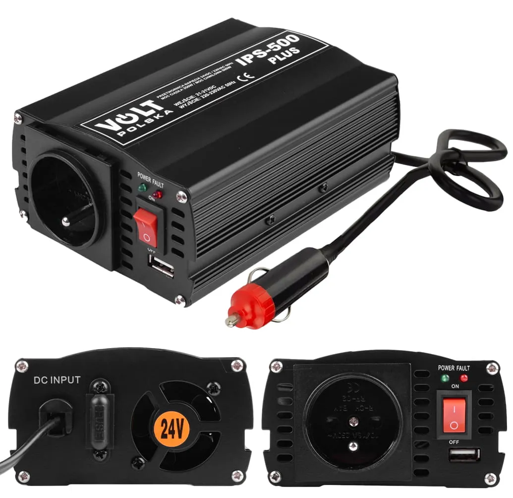Elektroniczna przetwornica IPS 500 PLUS 24V służy do zasilania urządzeń elektrycznych wymagających napięcia przemiennego 230V z akumulatorów i instalacji samochodowych o napięciu stałym 24V.