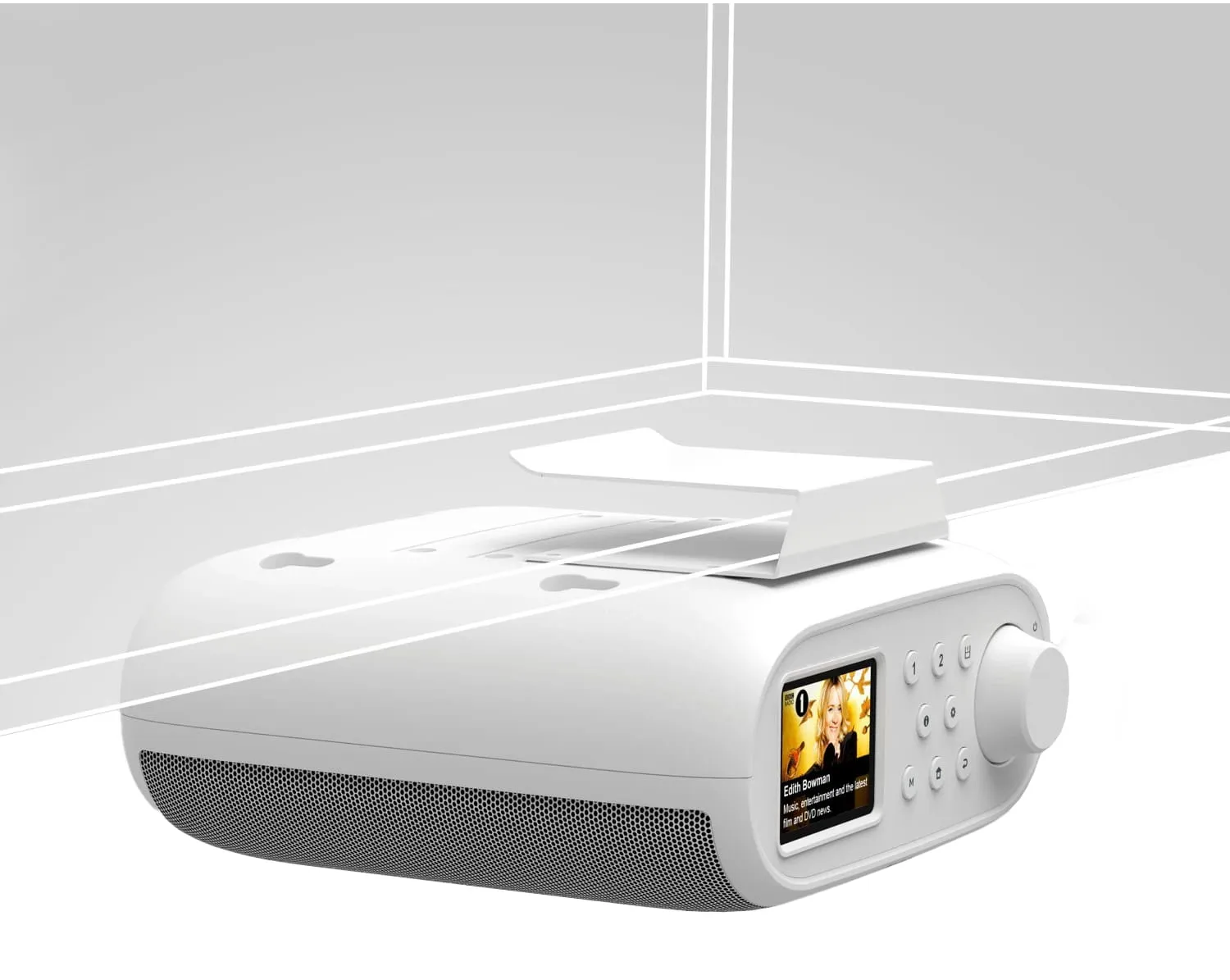 Dzięki możliwości montażu pod szafką, bez wiercenia za pomocą zacisków lub ustawienia na płaskiej powierzchni, radio doskonale dopasuje się do każdej przestrzeni. To idealne rozwiązanie do kuchni, biura czy warsztatu.