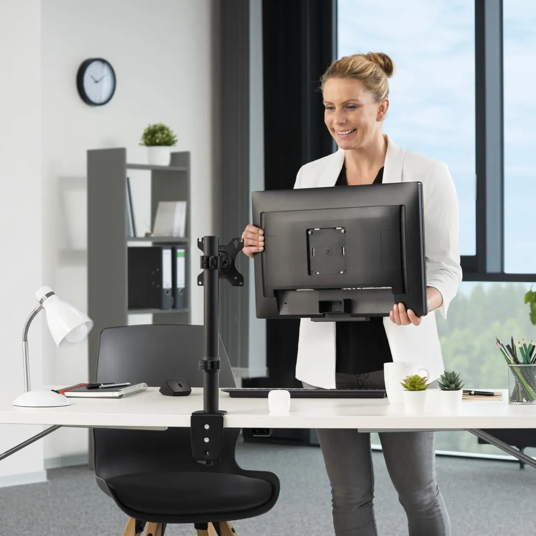 Uchwyt biurkowy umożliwia przymocowanie go do blatu za pomocą zacisku. Taki rodzaj uchwytu jest skierowany przede wszystkim do osób chcących zachować miejsce na biurku, co pomoże poprawić nie tylko ergonomię pracy, ale również zapewni czystość i nienaganną estetykę przy stanowisku komputerowym.