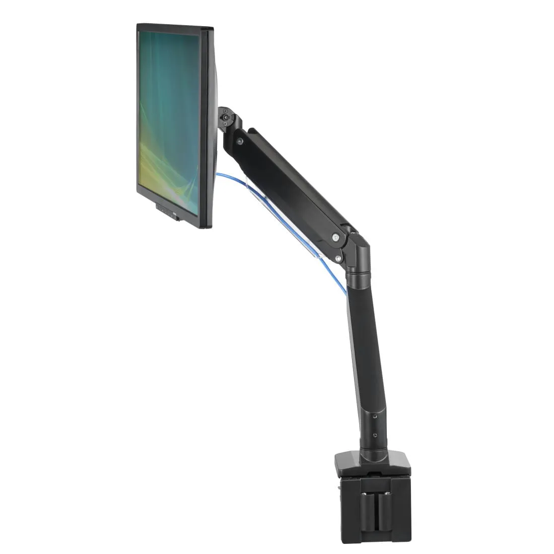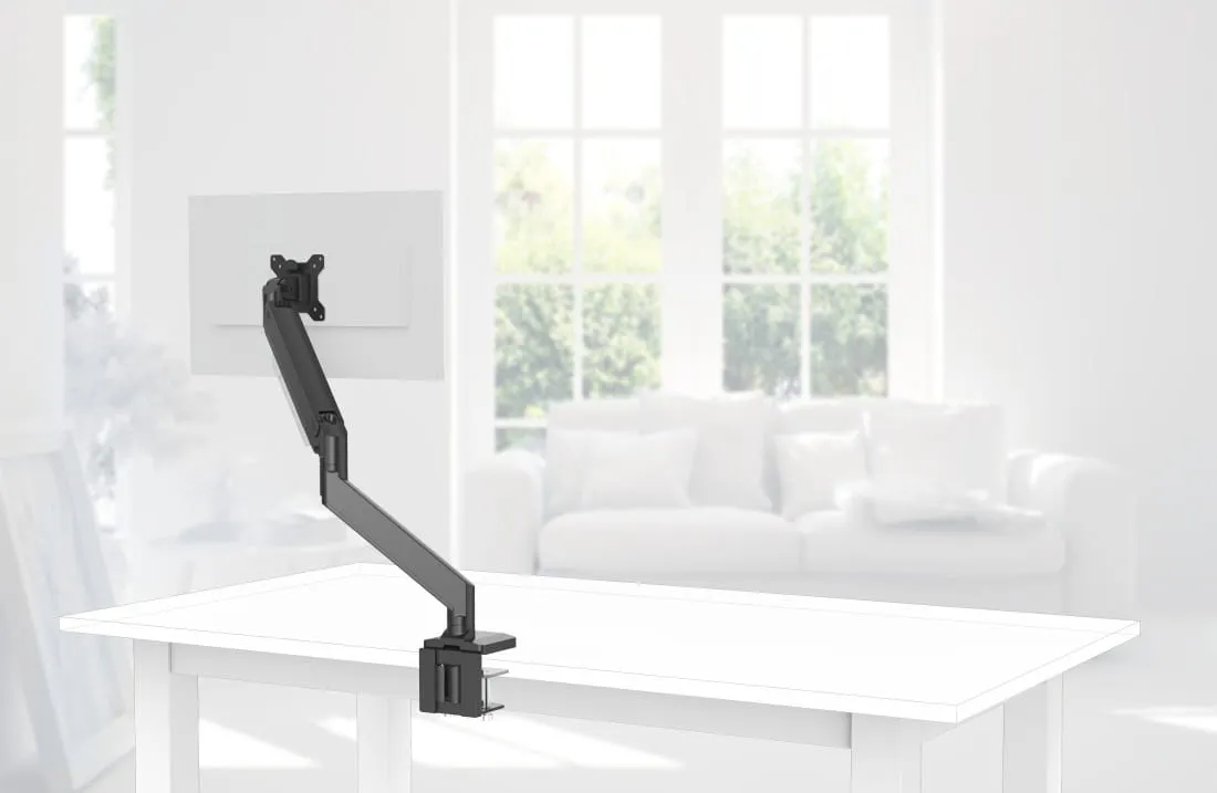 Uchwyt biurkowy umożliwia przymocowanie go do blatu za pomocą zacisku. Taki rodzaj uchwytu jest skierowany przede wszystkim do osób chcących zachować miejsce na biurku, co pomoże poprawić nie tylko ergonomię pracy, ale również zapewni czystość i nienaganną estetykę przy stanowisku komputerowym.