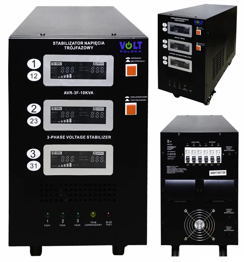 Stabilizator pracuje w trybie trójfazowym, czyli wyrówna zbyt wysokie lub zbyt niskie napięcie wejściowe i poda na wyjściu napięcie po stabilizacji.