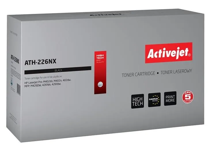 Toner firmy ActiveJet oryginalnie zapakowany w folię ochronną i pudełko.