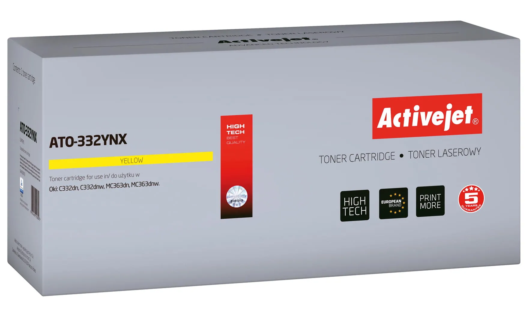 Toner firmy ActiveJet oryginalnie zapakowany w folię ochronną i pudełko.