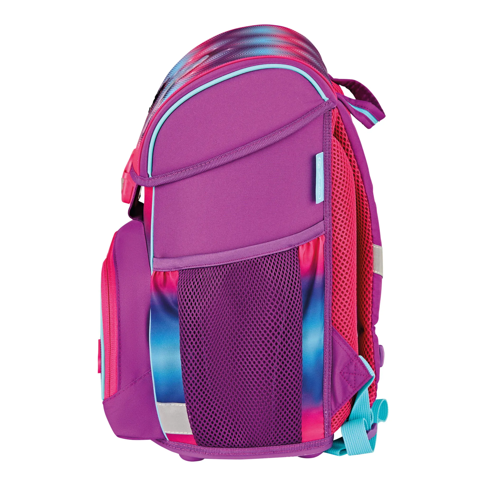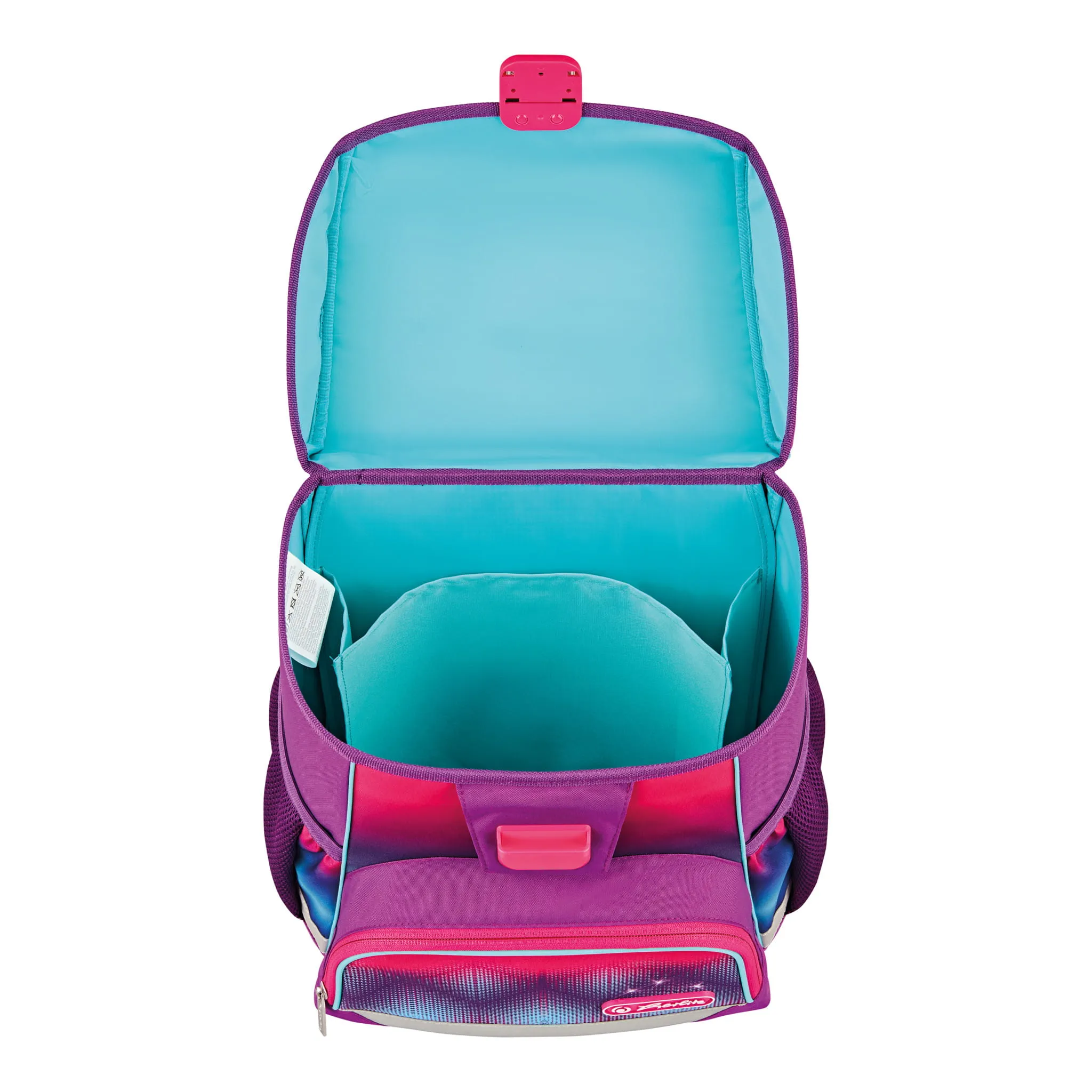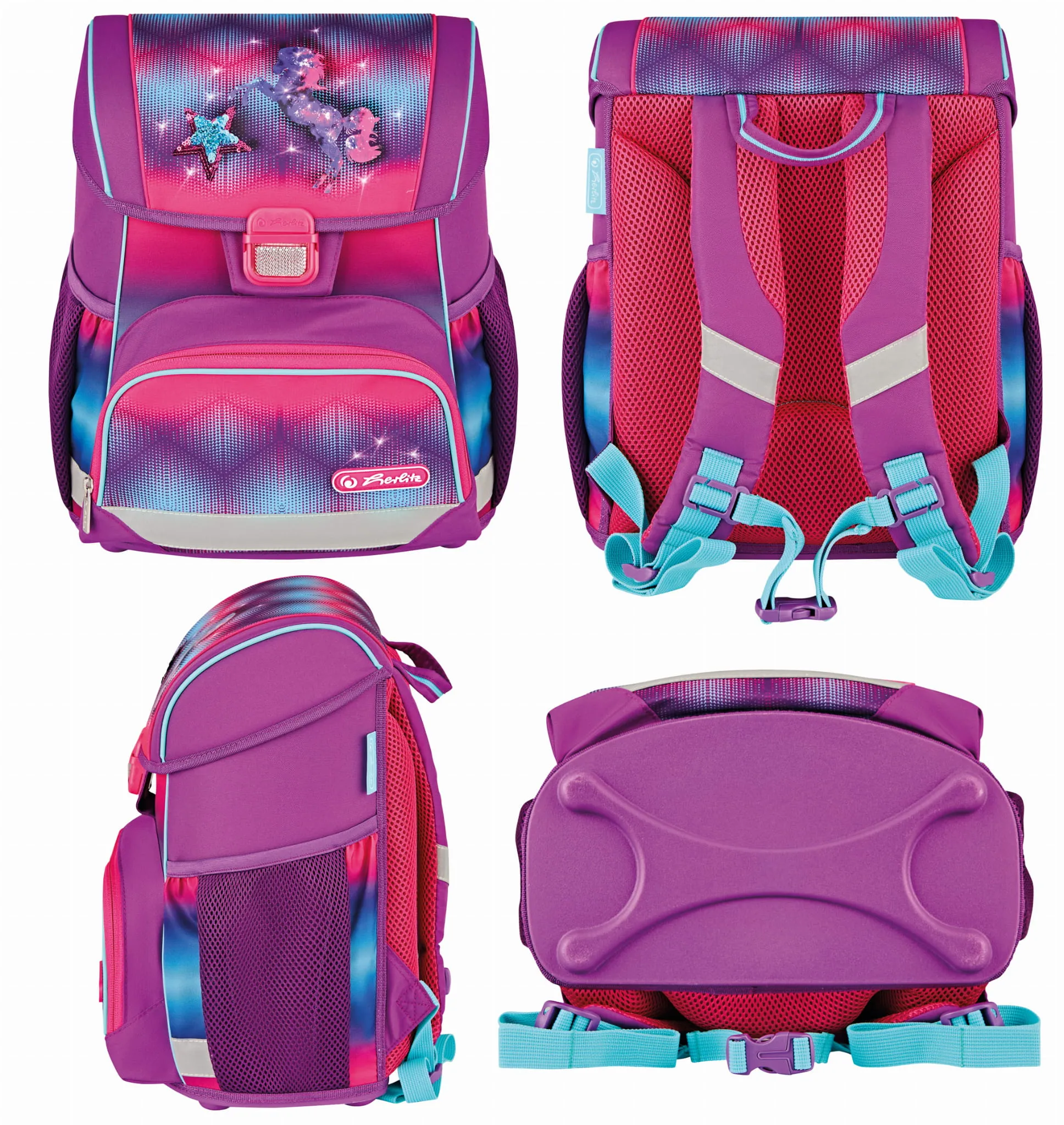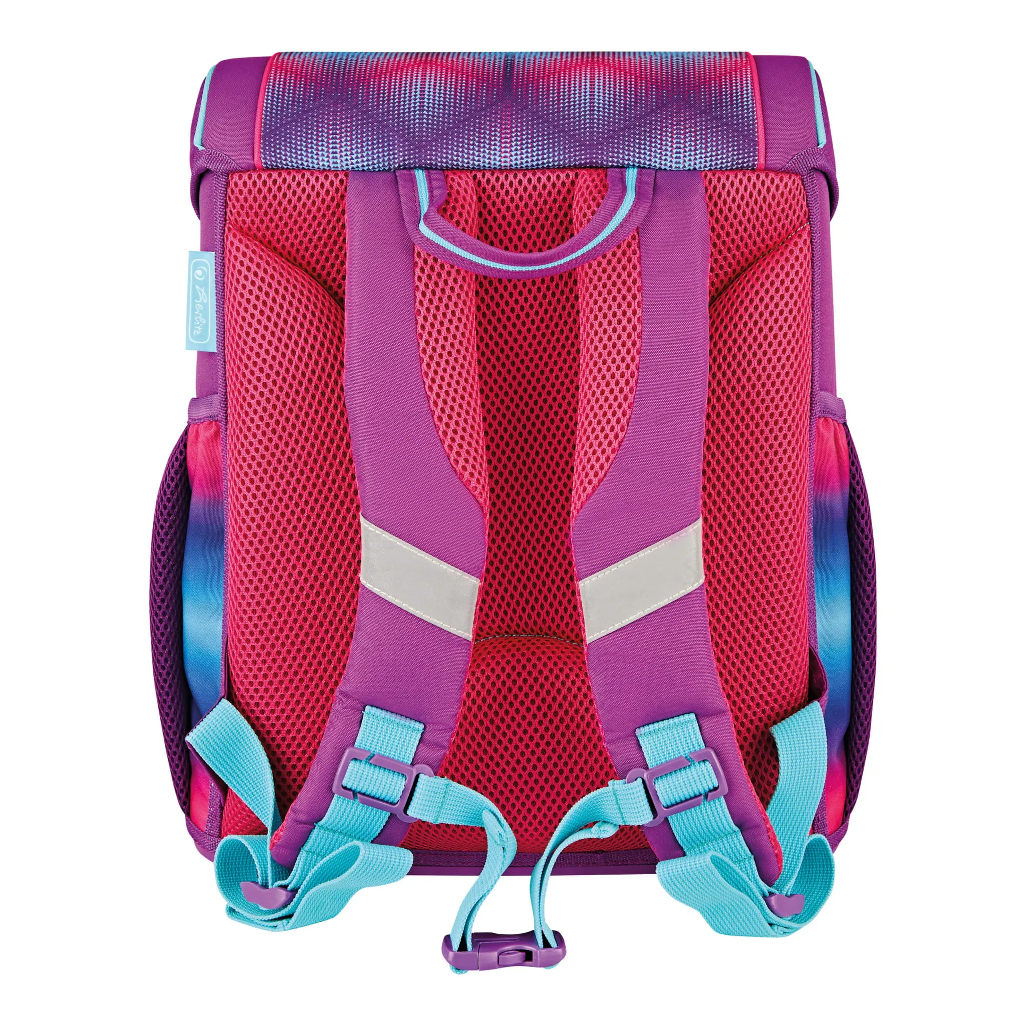 Plecak szkolny Herlitz Loop posiada nóżki stabilizujące oraz odblaski 3M Scotchlite na przedniej i bocznych kieszeniach oraz na szelkach. Wygodny uchwyt pozwala na komfortowe przenoszenie tornistra.