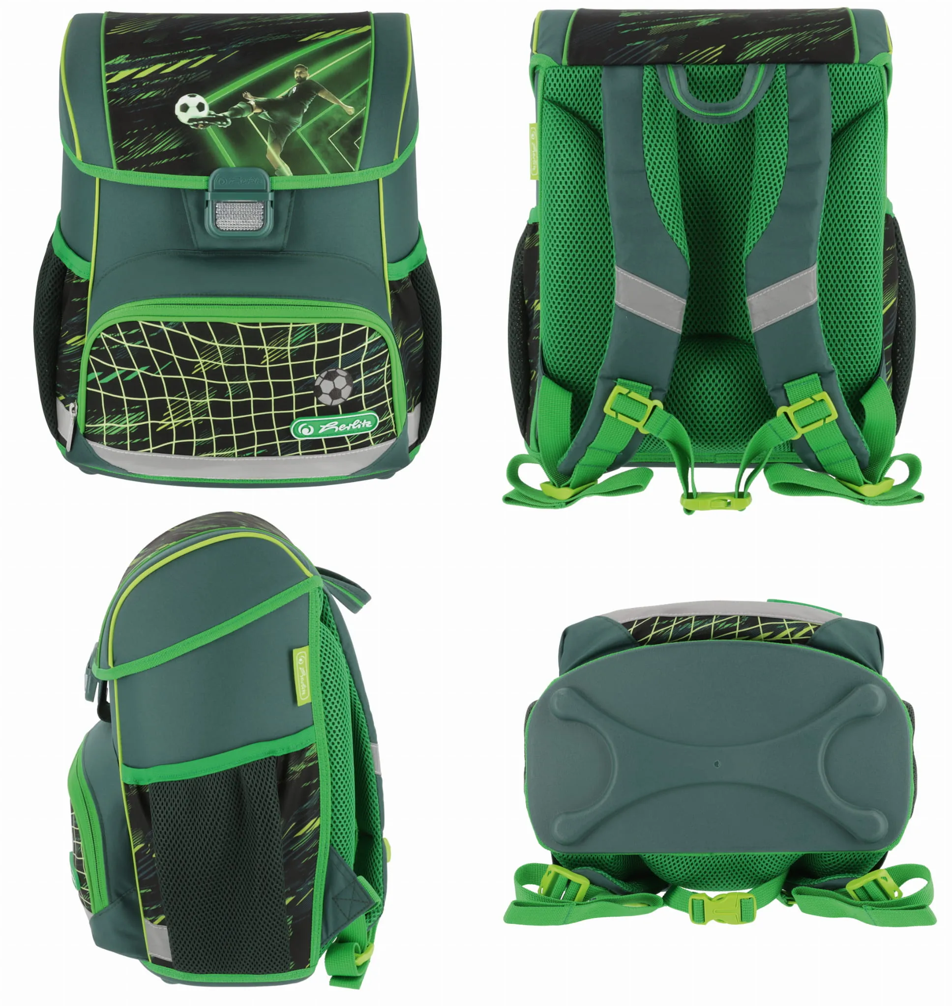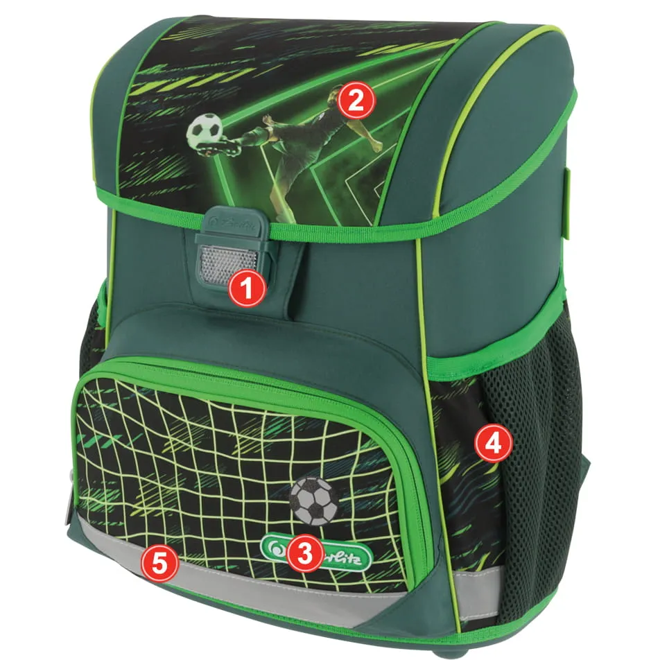 Plecak szkolny Herlitz Loop posiada nóżki stabilizujące oraz odblaski 3M Scotchlite na przedniej i bocznych kieszeniach oraz na szelkach. Wygodny uchwyt pozwala na komfortowe przenoszenie tornistra.