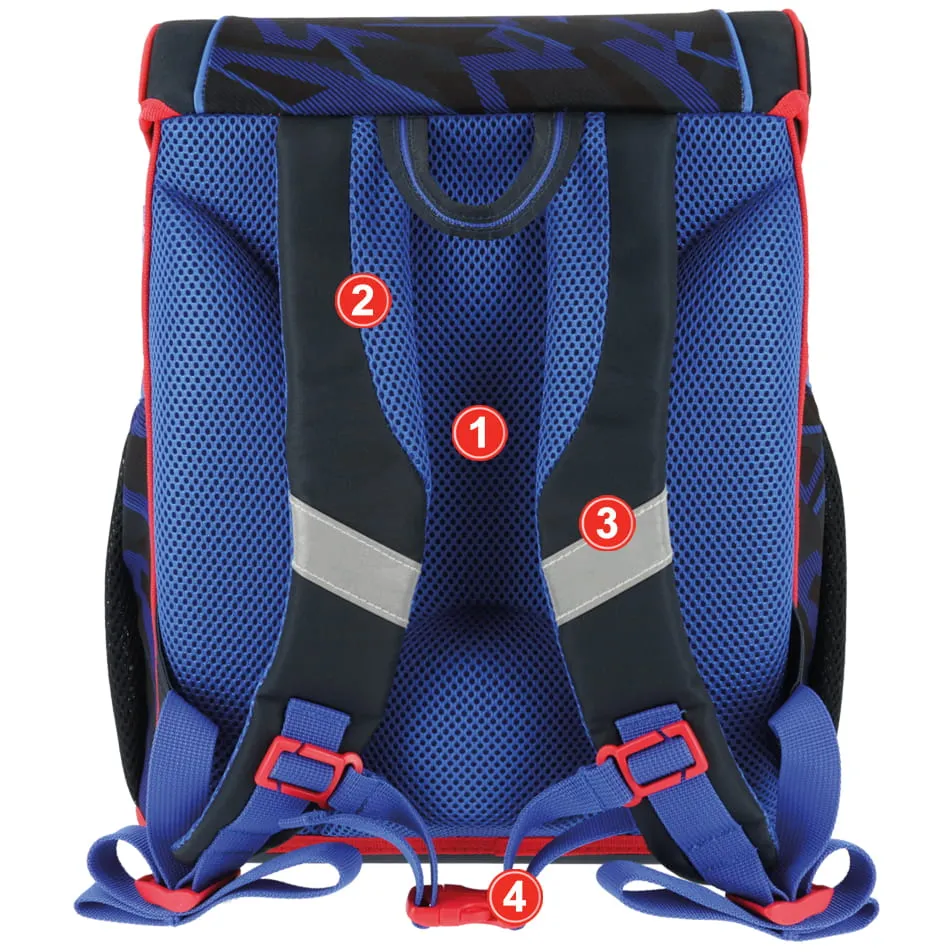 Tornister wyposażony jest w dużą, sztywną komorę z wewnętrzną przegrodą organizującą jego przestrzeń. Przednia kieszeń zapinana jest na zamek. W dwóch kieszeniach bocznych ze ściągaczem bez problemu zmieści się butelka z napojem i drugie śniadanie. Tornister zamyka wygodna w użyciu klamra z odblaskiem.