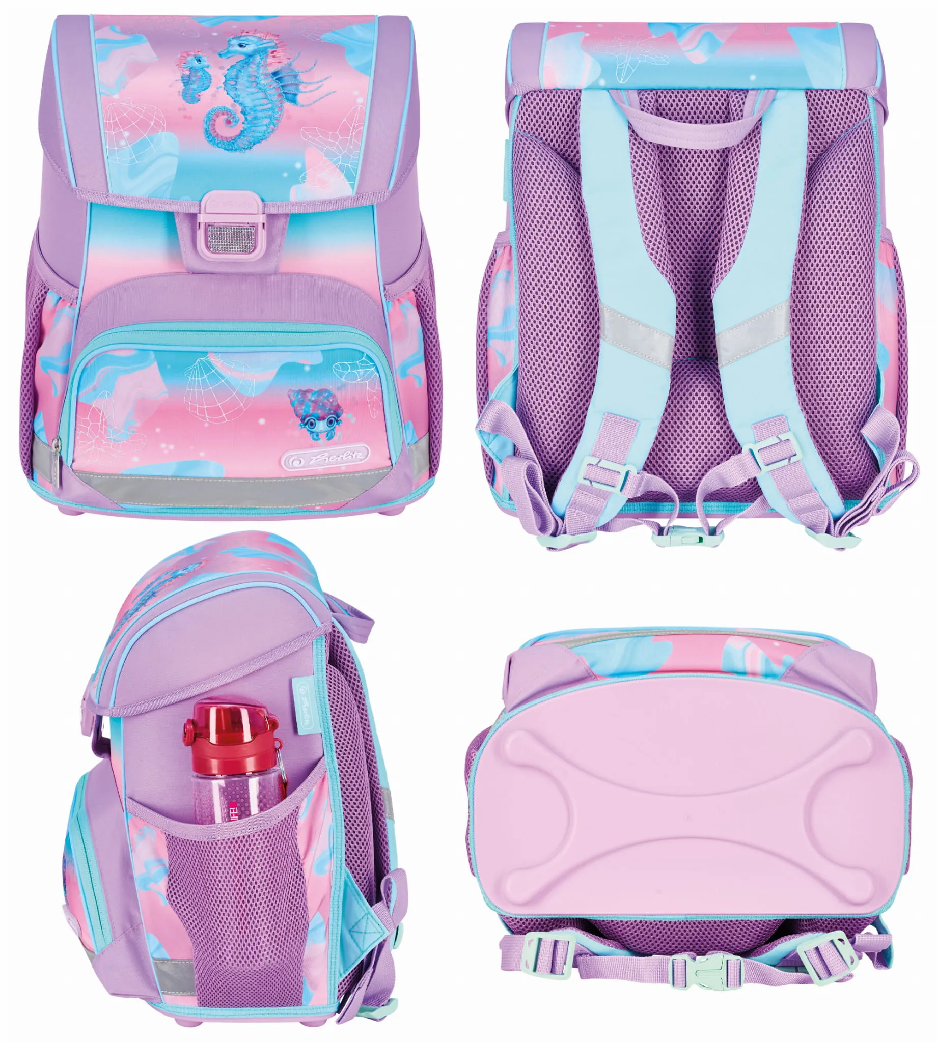 Plecak szkolny Herlitz Loop posiada nóżki stabilizujące oraz odblaski 3M Scotchlite na przedniej i bocznych kieszeniach oraz na szelkach. Wygodny uchwyt pozwala na komfortowe przenoszenie tornistra.