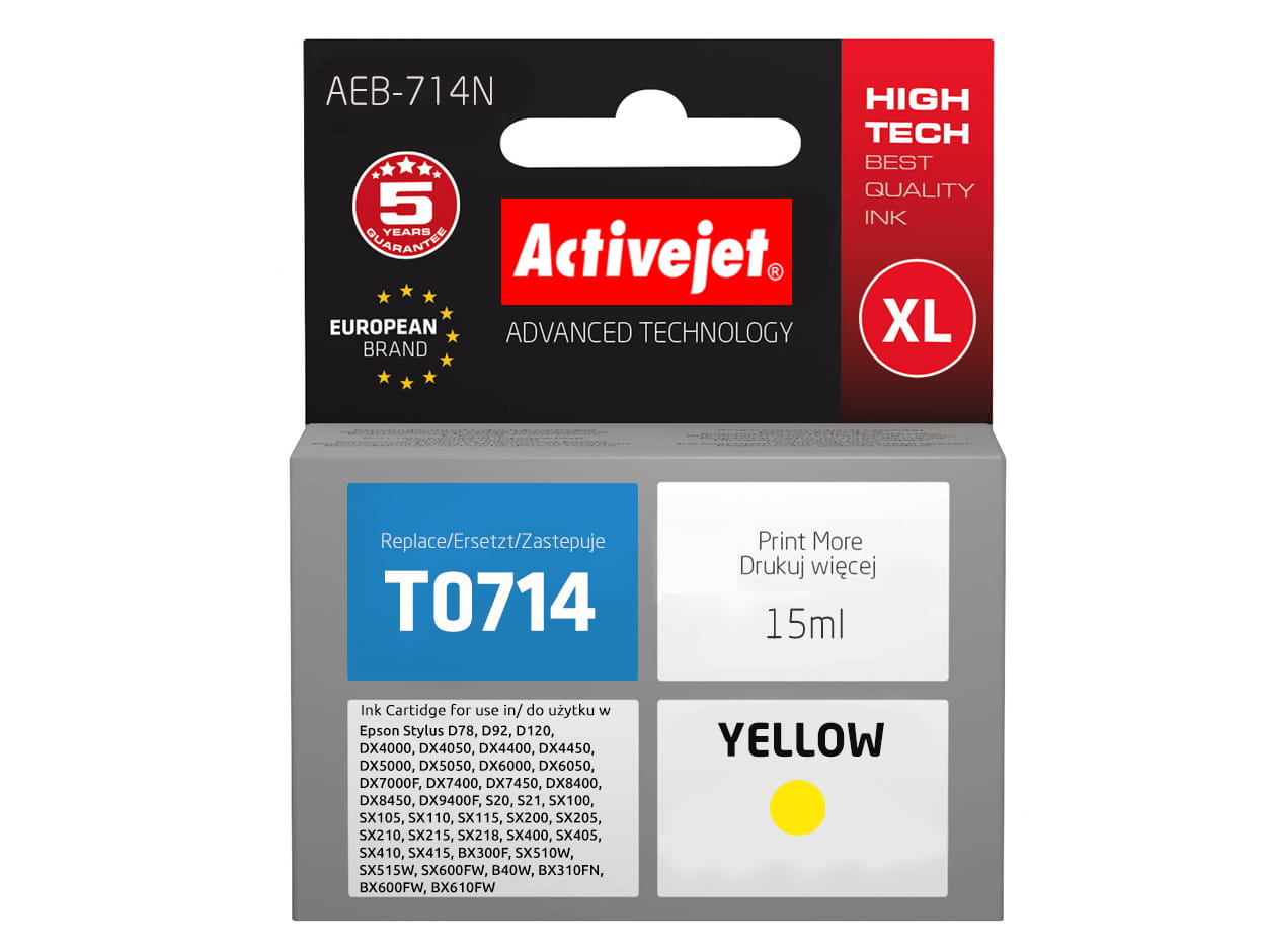 Tusz ActiveJet AEB-714N do drukarki Epson (zamiennik T0714) DX4000 DX5000 SX100 S200 – żółty (yellow)