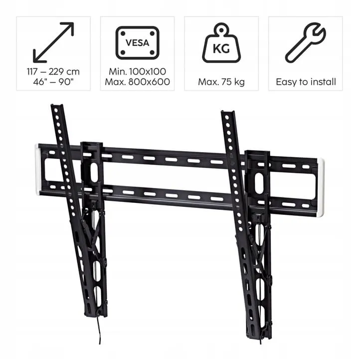 Uchwyt do telewizora jest przeznaczony do urządzeń o przekątnej ekranu od 46" do 100" (117 – 254 cm). Jest zgodny ze standardem VESA od 100 x 100 do 800 x 600. Maksymalne obciążenie uchwytu wynosi aż 75 kg.