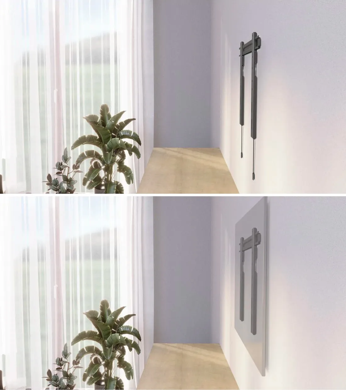 - Praktycznie brak odległości od telewizora: ultrapłaski uchwyt ścienny do telewizora ma bardzo mały odstęp od ściany wynoszący zaledwie 14,5 mm.