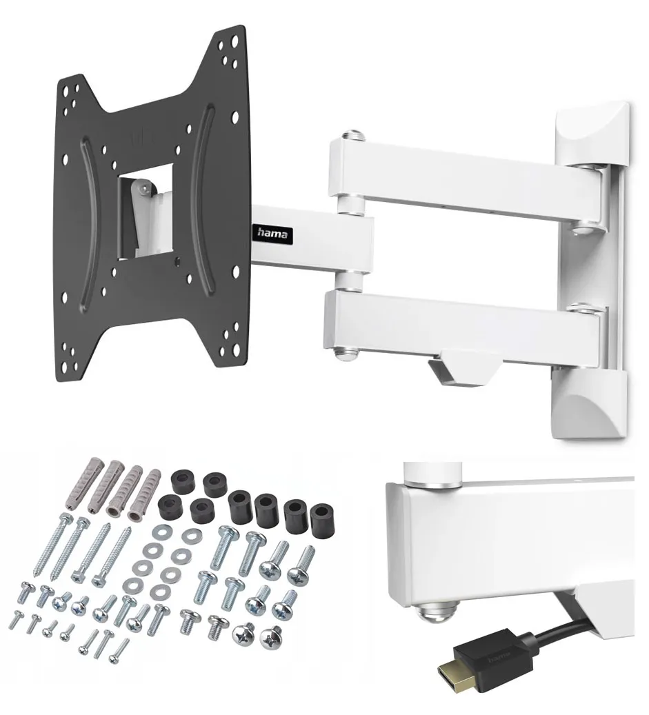 Wraz z uchwytem do telewizora Hama otrzymujesz zestaw montażowy, w tym kołki renomowanej marki Fischer, poziomnicę, szablon wiercenia oraz instrukcję montażu. Jeśli uchwyt został lekko krzywo zamontowany, można później korygować pozycję telewizora pod kątem kilku stopni w poziomie.