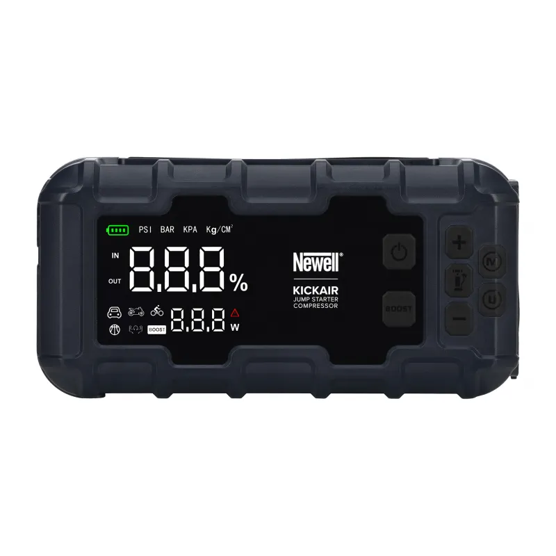Newell KickAir to wielofunkcyjne urządzenie 4w1 – rozrusznik do akumulatora, kompresor (elektryczna pompka), power bank i latarka LED. Pozwala uruchomić samochód prądem szczytowym 2000A (silniki benzynowe do 8 l, silniki Diesla do 6 l), skorzystać z funkcji wymuszenia startu i dopompować koła (maks. 11 bar). Wszystkie parametry pracy sprawdzisz na czytelnym, podświetlanym ekranie LCD. Power bank o pojemności 20000mAh oferuje port USB-C (PD 65W) oraz dwa porty USB-A (QC 18W). Zaawansowany system zabezpieczeń, odporność na temperatury od -20°C do +60°C, szybkie ładowanie w ok. 2 godziny oraz solidne etui dopełniają całości, zapewniając bezpieczeństwo i niezawodność w niemal każdej sytuacji.