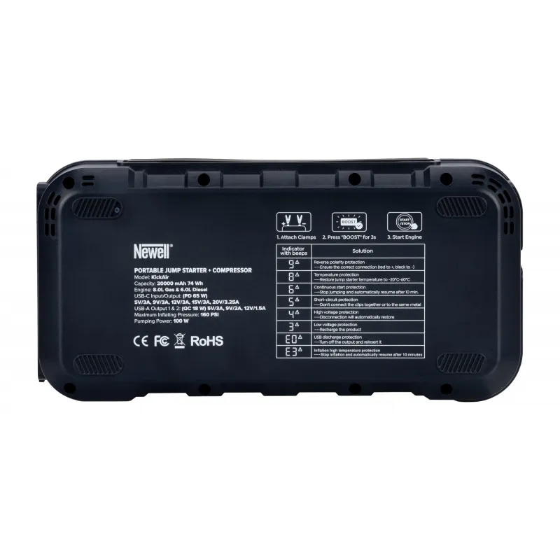 Urządzenie rozruchowe z kompresorem Newell KickAir wyposażono w zaawansowany system zabezpieczeń chroniący zarówno Ciebie, jak i Twój pojazd. Nawet jeśli przez przypadek pomylisz bieguny, łącząc plus z minusem (albo na odwrót) zasilanie zostanie automatycznie odcięte, zanim dojdzie do zwarcia. Na pokładzie nie zabrakło też nowoczesnych algorytmów chroniących przed przeładowaniem, przeciążeniem, przegrzaniem, odwrotną polaryzacją i głębokim rozładowaniem. Urządzenie spełnia normy bezpieczeństwa potwierdzone certyfikatami CE, FCC i RoHS.