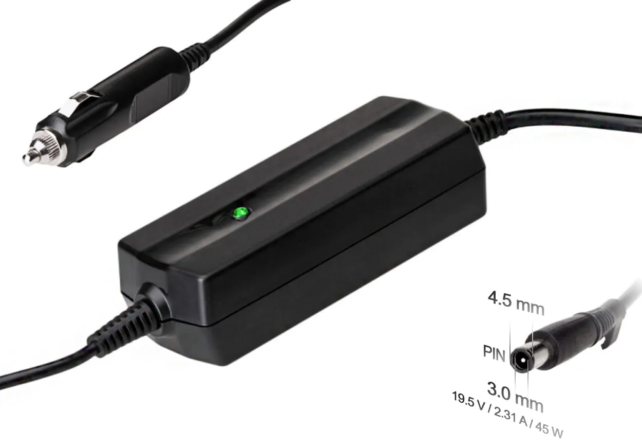 AK-ND-75 to zasilacz samochodowy służy do ładowania laptopów marki DELL o mocy 45W, kompatybilny ze wszystkimi modelami laptopów zasilanymi prądem 19.5V i maksymalnie 2.31A, oraz z wtyczką 4.5x3.0 mm + pin.