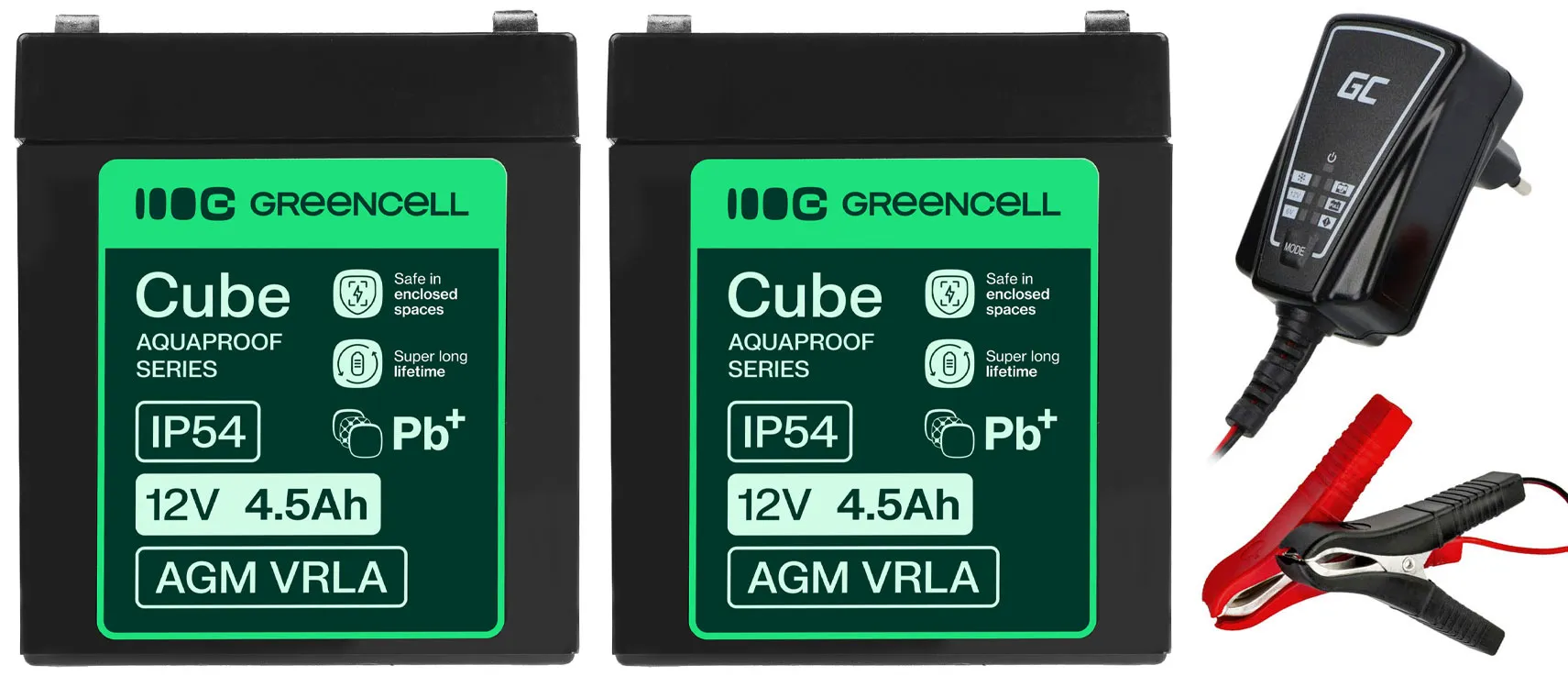 - Dwa akumulatory firmy Green Cell Cube AGM VRLA IP54 12V 4.5Ah