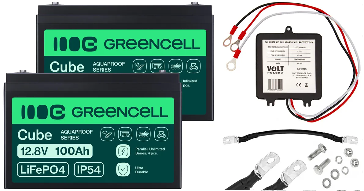 - Dwa akumulatory firmy Green Cell Cube LiFePO4 100Ah 12.8V 1280Wh