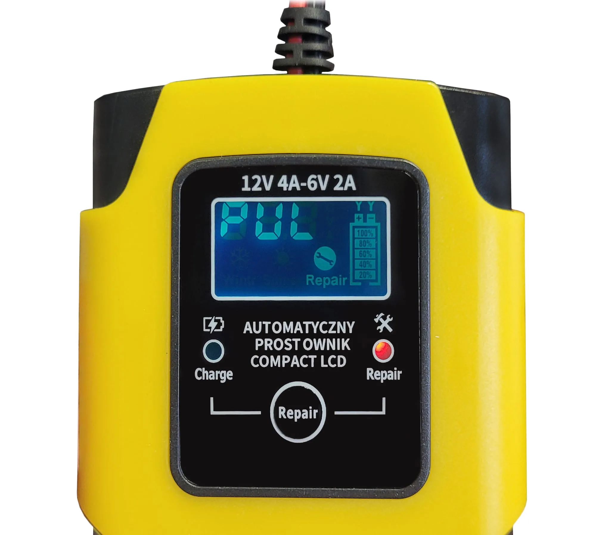 Prostownik automatyczny LCD 12V 4A / 6V 2A COMPACT to automatyczny prostownik z 7-stopniowym ładowaniem akumulatorów tradycyjnych, akumulatorów kwasowo-ołowiowych, żelowych (GEL), AGM, VRLA o pojemności od 4AH do 40AH.