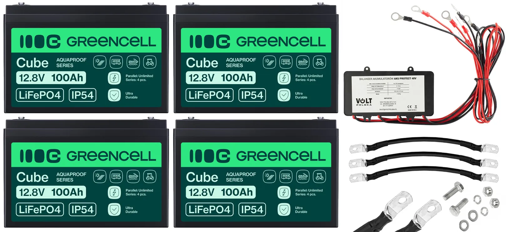 - Cztery akumulatory firmy Green Cell Cube LiFePO4 100Ah 12.8V 1280Wh