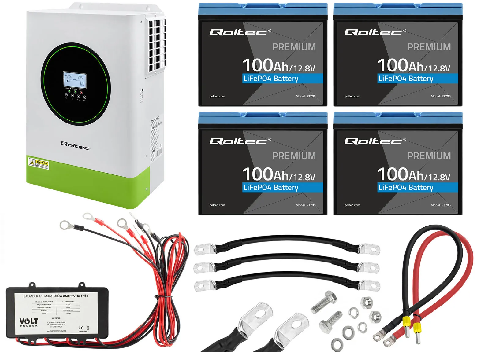 - Cztery akumulatory Qoltec LiFePO4 12.8V 100Ah (100A) + bezobsługowy BMS