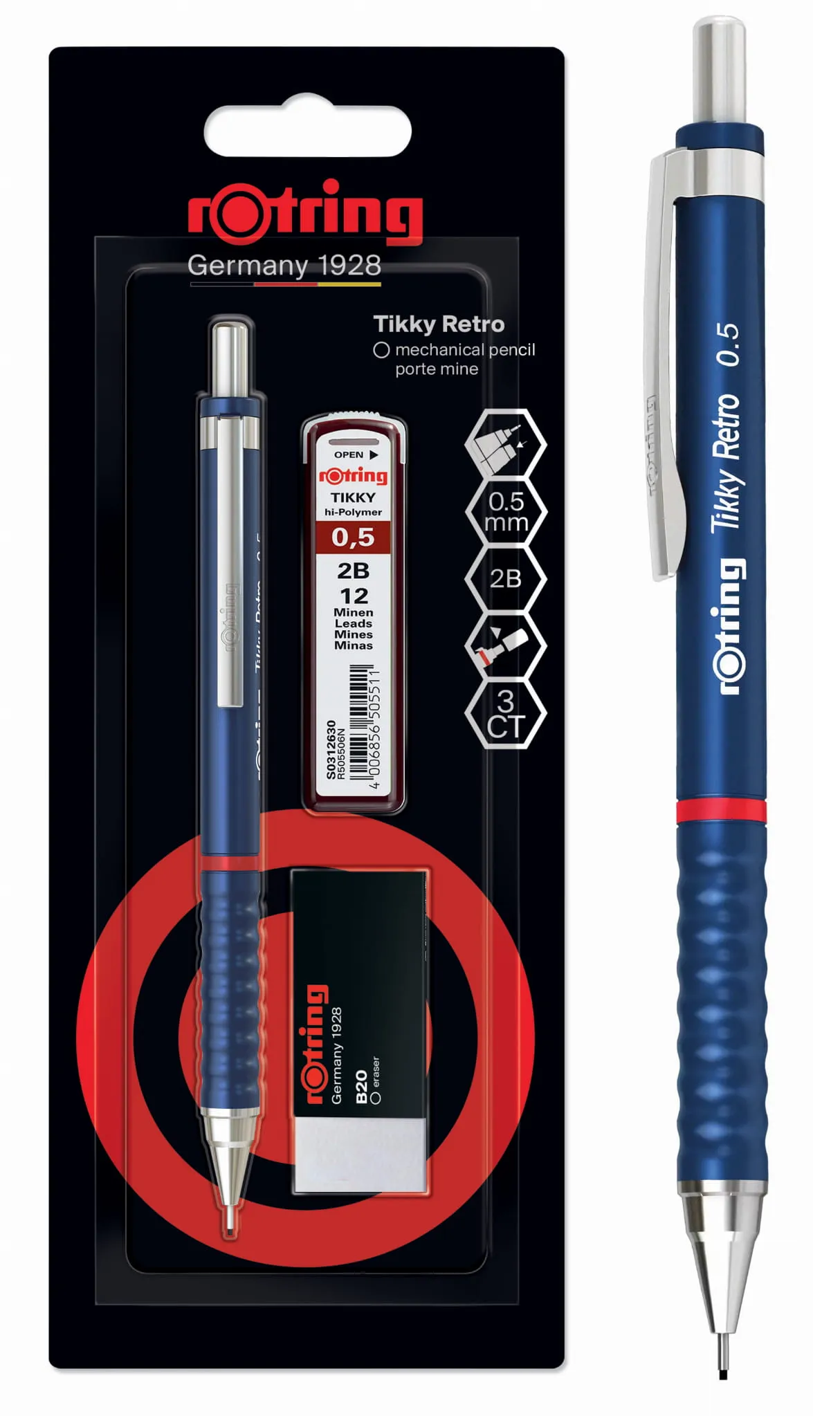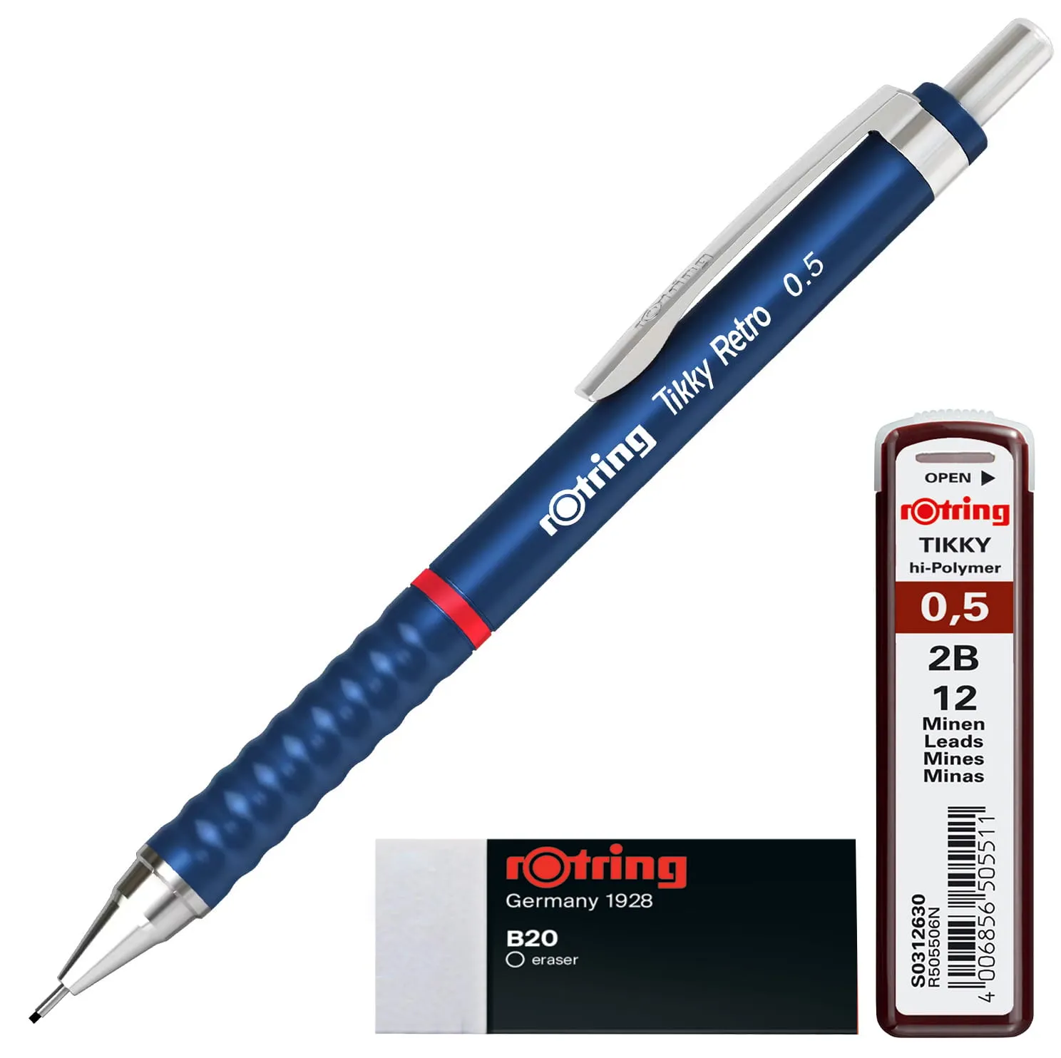Zestaw rOtring Tikky Retro: niebieski ołówek automatyczny 0.5mm + wkłady grafitowe 2B 0.5mm + gumka